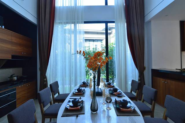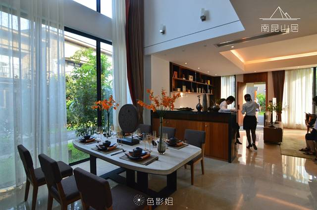 餐桌上安静的立了一支花,在一个白色的花瓶里,我拉开一把椅子坐下,啊,这椅子可真舒服!大大的六人餐桌,阳光洒在浅色的整石台面上,别墅里静悄悄的,窗外是灿烂的阳光,35度,隔着一个窗户,我坐在这里,28度,在盼望我约的朋友快快到来,过来和我坐在一起,我们一起聊天品茗,用这套漂亮的茶具,泡起功夫茶,这里有备好的铁观音,快乐侃起来!嗯如果你不爱绿茶,可以自带哦,我就带了喜欢的普洱。
