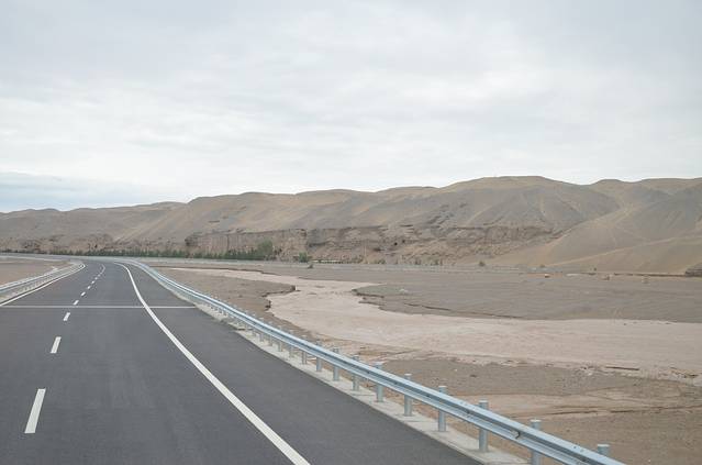 完成拿票等候一系列过程后,就开始准备乘坐数字展示中心的大巴车。下图为在大巴车上望外景。大巴车还要行使一段时间就能到正真的莫高窟啦。