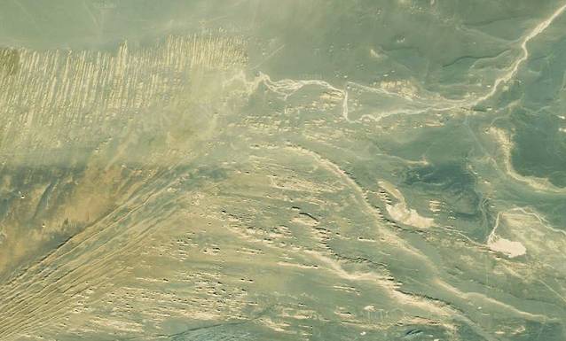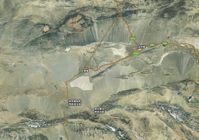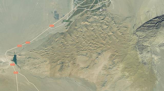 鸣沙这种自然现象在世界上不仅分布广,而且沙子发出来声音也是多种多样的。如在美国夏威夷群岛的高阿夷岛上的沙子,会发出一阵阵好像狗叫一样的声音,所以人们称它是“犬吠沙”。苏格兰爱格岛上的沙子,却能发出一种尖锐响亮的声音,就好像食指在拉紧的丝弦上弹了一下。在中国的鸣沙山滚下来,那沙子就会发出轰隆的巨响,如打雷一般。下图为敦煌鸣沙山的卫星图。可以看到这半还是绿洲,南面却成了沙漠,之后会通过摄影更加直观的给大家看到这条分界线。