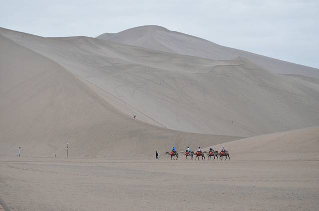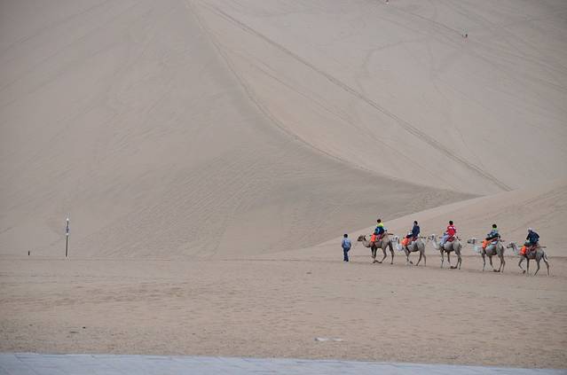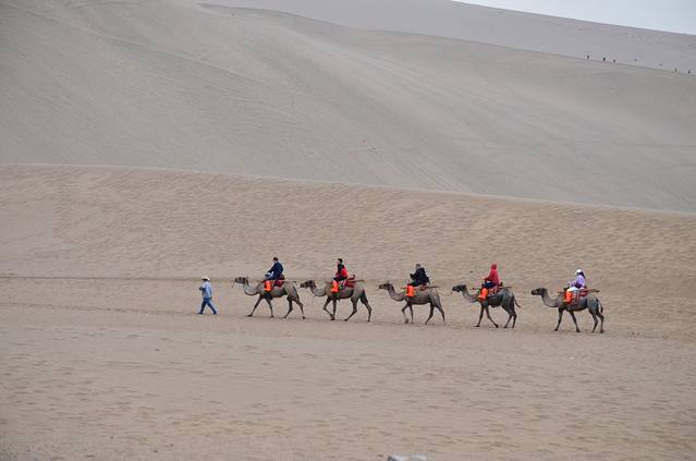 图为刚进入鸣沙山之后看到的骆驼骑行队。