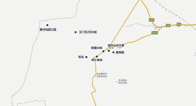 景点包括:敦煌影视城(又名敦煌古城)(50)、西千佛洞(15)、阳关(50)、雅丹地貌(又名魔鬼城)(120)、玉门关(40)、汉长城(40)。