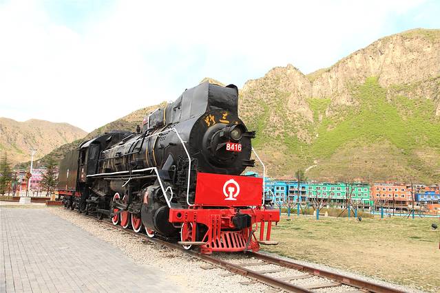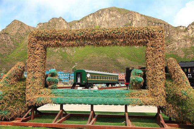 广场上的相框绿雕让人眼前一亮,透过相框,广场上的火车头和绿皮车厢俨然一张老照片。