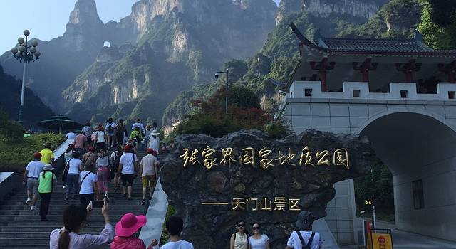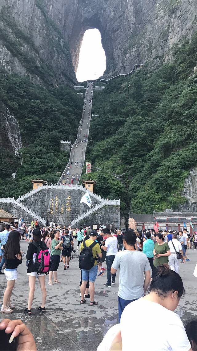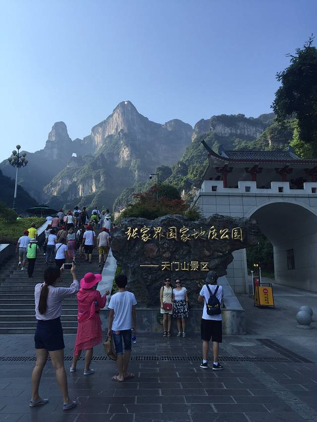 天门山,可以选择自己爬上那999个阶梯(特别需要勇气的),然后走到上面了有免费电梯坐,也可以选择从山下坐电梯上去(上去是需要门票的)