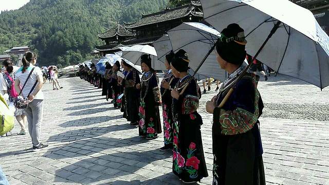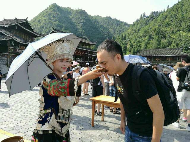 没吃苗家长桌宴,没逛够苗家山寨,出了景区恰好赶上了有名的“拦门酒”,偌大一个场地,旁边两排站着穿着民族衣服载歌载舞的老太太,满身银饰,头上还戴有一朵鲜花及一些小鸟样的头饰。中间一排摆着12张桌子,桌上放置一个装米酒的容器还有一个陶碗,就是传说当中的十二道拦门酒了。第一张桌子面前一位仙风道骨、长须飘瓢的长者,是这寨子里最为德高望重的长老;站在最中间的几张桌子前面是清一色颜值俊俏的妙龄少女,据说都是寨子里精挑细选出来的村花。后而部份则为一些年龄稍大的苗家妇女构成。