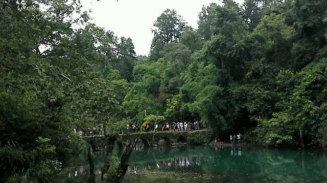 30公里左右路程,五个大些的景点,每个景点都有上下车的地方,可你说我们有这个胆子一个个看过来么?!迎着一路上排队大军羡慕中带着点复杂的目光,我们只能报以以同情的微笑,然后轻声对司机说了句:“不要停,直接去第五站。。”,默默地点开手机,在4g的世界里欣赏起小七孔的秀美风光来。请允许我的懒惰,“卧龙潭”的照片我直接从网上下载了,但我是真看到了撒,效果倒真没打折扣。其他的照片都是第五个景点小七孔桥沿路的,直接上图了。