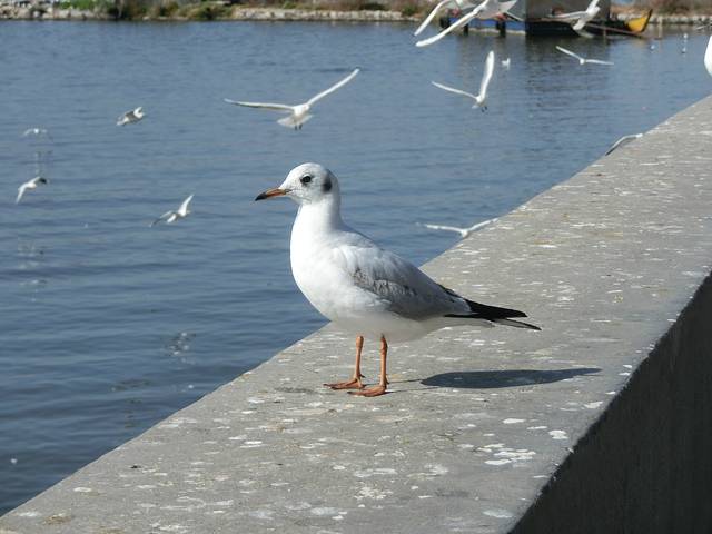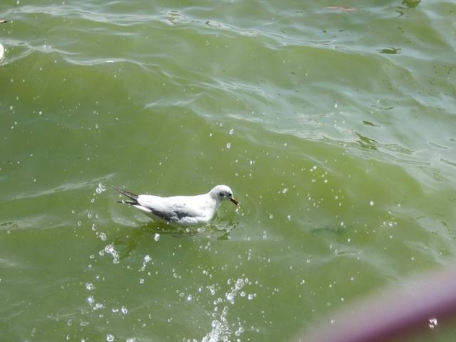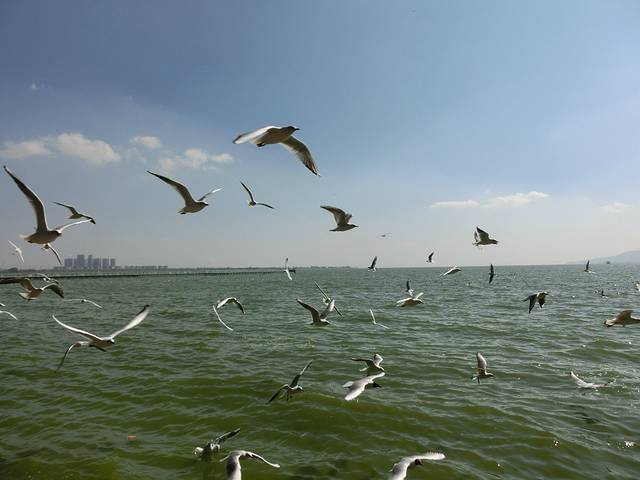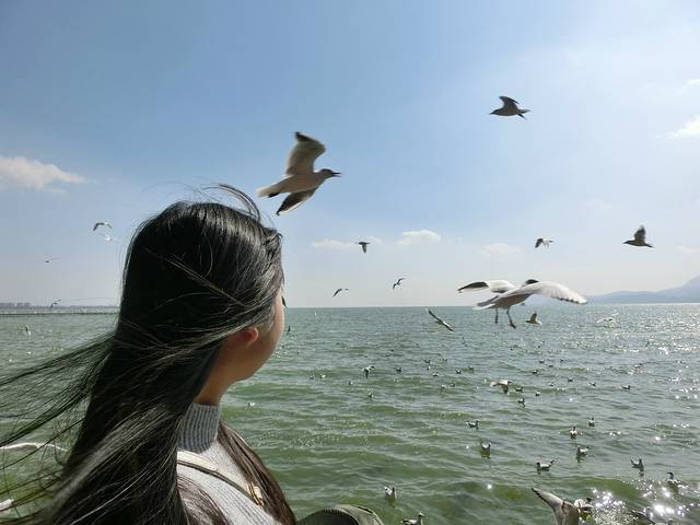刚走进就看到了一大片的红嘴鸥在空中盘旋,非常壮观。很多人在池边喂它们和照相。