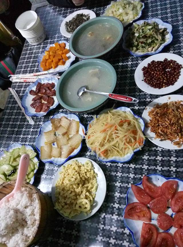 一番疯狂购物后,我们就回到老板的家吃晚饭了。晚饭很丰盛,其中还有特色的猪膘肉。据说猪膘肉是腌制很久的,猪口中放置一颗银子以保存不腐。不过个人觉得是真的太腻了。西红柿和另一个瓜很甜!甜到我第二天一路都想把泸沽湖的土豆 西红柿 苹果当手信带回去了。