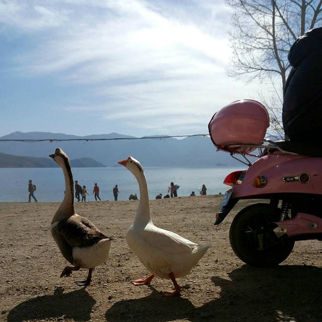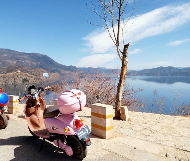 游船后和我们同行的5人便要坐车回丽江了,我和老赵、小玲就回各自的房间睡了一下,大概10点左右开始租电摩环泸沽湖。电摩是和隔壁旅店的老板租的,原价80/台,我们讲价到了60/台。