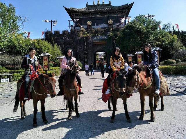 一开始我是拒绝骑马的,但在最后被朋友们说服了,就四个人一起骑马下去,然后还在天龙八部影视城的大门站成一排照了个照片。价格是30/人吧,因为是淡季所以都挺便宜的。