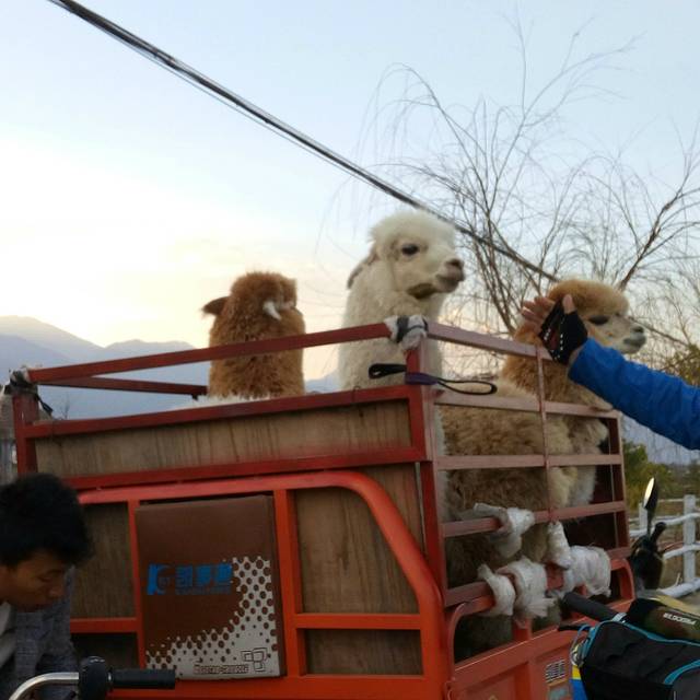 在回来的路上我们遇到了好多动物,比如在前面跟着主人电摩跑的古代牧羊犬,还有直接横行一排霸占马路的羊,还有车上的超级大羊驼,第一次知道原来羊驼体型是这么大的。