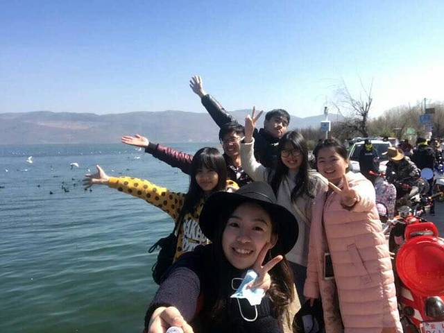 环海公路离洱海还是有段距离的,开着开着我们到了能比较近接近洱海的路段。在这里又遇到了刚刚的情侣,大家就一起拍了个照,我们还是一见人就问能不能吃惯这里的食物,他们也是说吃不惯的。这个路段隔壁有很多观景房,住在这里看着洱海真是一种享受。