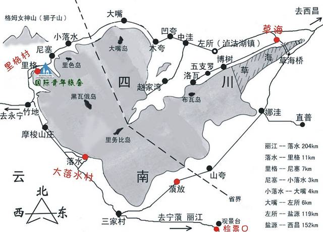 从上面泸沽湖的地图中可以看到,大洛水村的岸线相对平缓,因此落水的湖景房都是较多且便宜、并且货真价实的。而里格是整个泸沽湖景色最美的地方(个人认为其实每个地方的泸沽湖都很美),但岸线相对曲折,所以这里很多的“湖景房”都是骗人的,房湖之间隔了一大片的地。真正的湖景房集中在里格半岛,就是上图中里格和尼塞之间的白色突出来的小岛,而这个价格基本是非常贵而且必须提前预定的(房源十分抢手)。关于住宿可以就个人喜好和预算选择吧。
