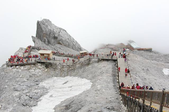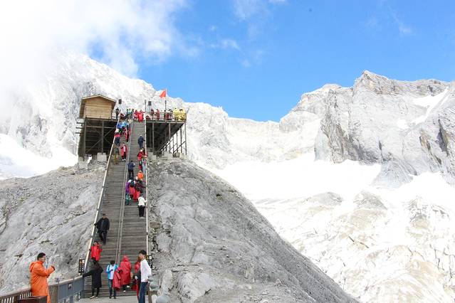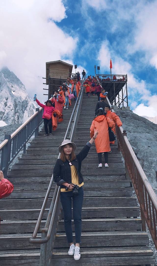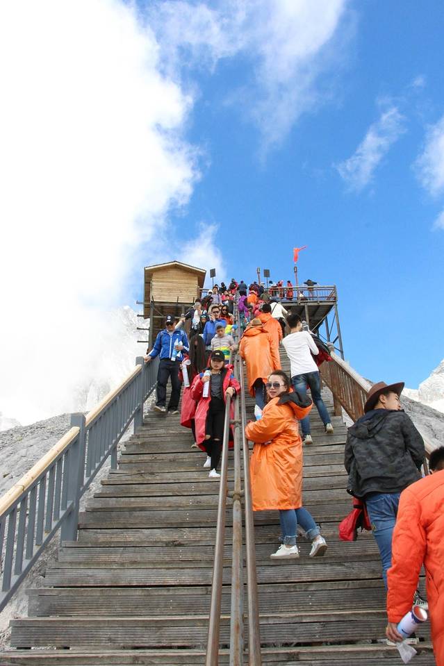 栈道设计得已够人性化,一段台阶后会有平台可以休息,但这是四千多米的雪山,缺氧带来的腿部酸痛、耳压升高,会让爬山负担更大。那件羽绒服,穿又穿不住,丢也丢不掉......