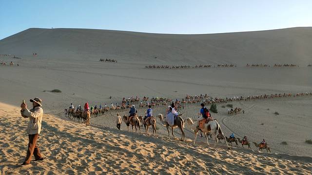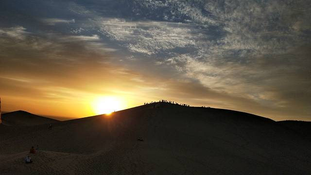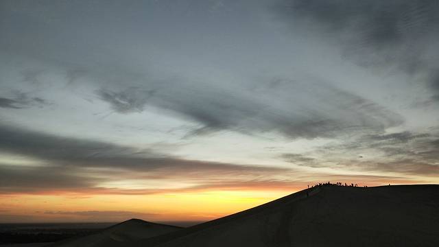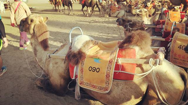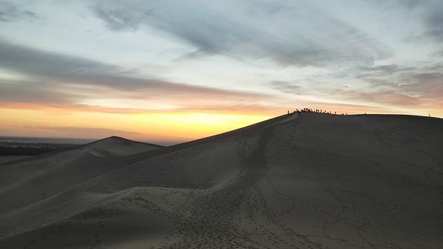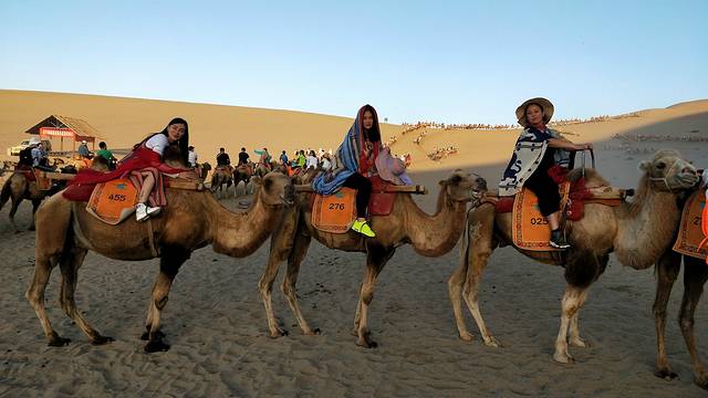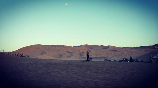 白天是不能进入沙漠的,温度太高,会把人灼伤!所以下午我们在客栈休息了,下午七点左右赶往鸣沙山月牙泉骑骆驼,骑骆驼的人太多,我们出发的也稍晚了些,应该提前去排队买票的,之后时间九点左右,即将日落,我们赶不及看日落玩滑沙了,索性就拍起了照片,然后去敦煌夜市看看~