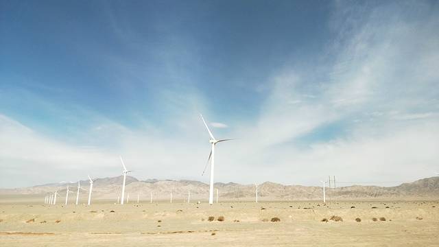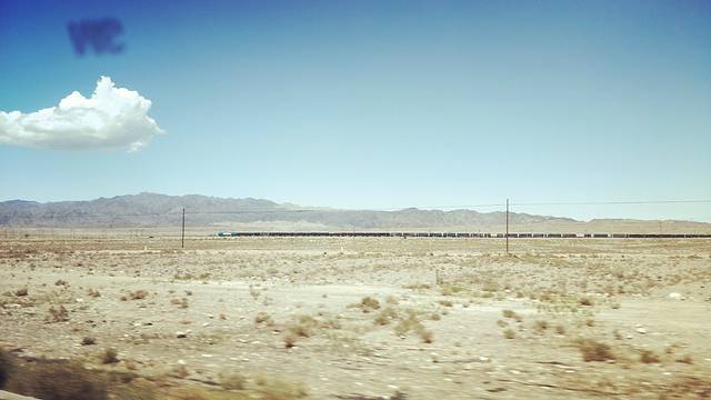 戈壁中行进的列车,远远看去像是一条长虫在蠕动~