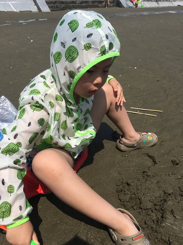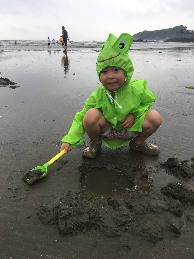 雨停了风还很大,儿子穿着雨衣到海边挖沙子。