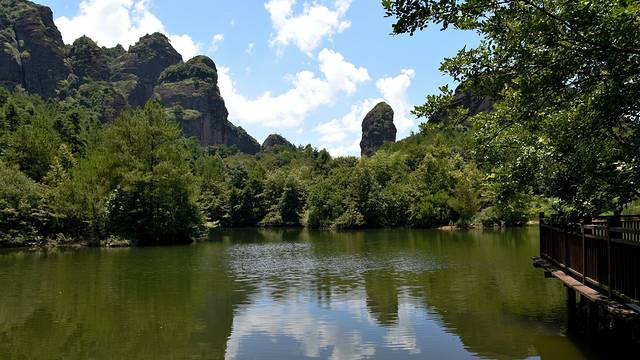 我沿着游道向前走着,微风吹动水面,阳光很是温和,出现在我眼前的是典型的丹霞地貌风景。游道修在山体旁岩壁上,一眼望去山壁犹如天堑,从上往下垂直落地很是巍峨,石壁历经千万年的风化好似伤痕累累,偶尔有一处,藤蔓爬满了岩壁,为这山壁挂上一丝清缕,让人看得奇特又壮观。
