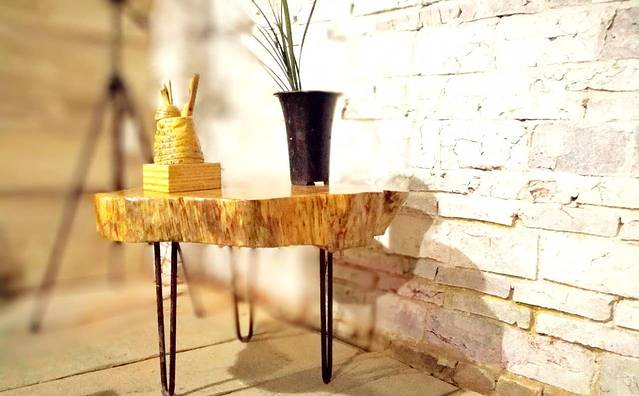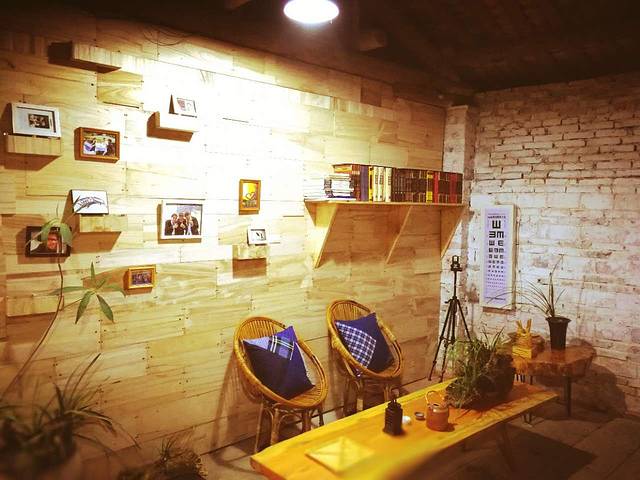 大厅尽可能多保留了原来的建筑风格:几十年的老木门和旧地板,以及各种旧门板切割的文化墙。竹本木南先生亲手打造的老树桩年轮茶几,中西合璧的设计风格 ,相得益彰。简约的实木搭建,简单而实用,桌上的绿树植物错落有致的排放着,屋里绿意盎然,充满生机。