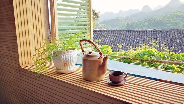 竹本木南先生是第一个关注到荔波手工土砖的魅力的人,因为土壤缘故形成的漩涡酷似梵高笔下的星空漩涡,谓之梵高砖。阳光闲适的午后,光影静懿的夜晚,茶几拐角处客厅就是书架,随意从中抽取一本书莱阅读,怡然自得。