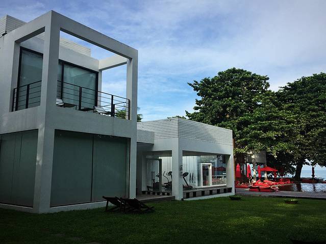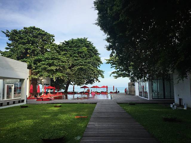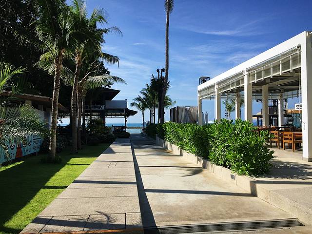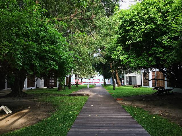 门口一进去就是直直的一条木板路通往泳池和海,两边是一栋栋酒店房间。