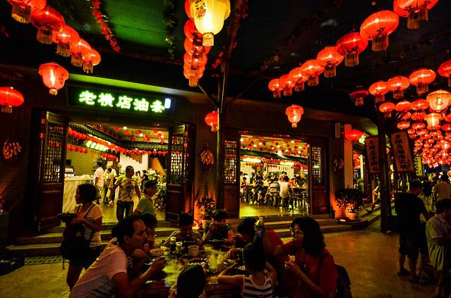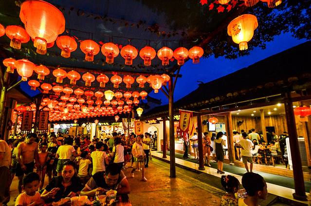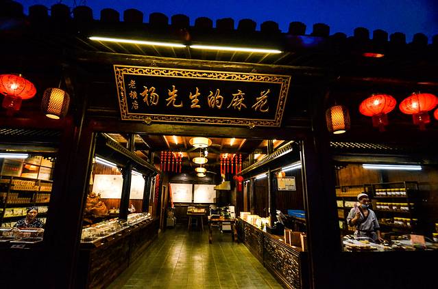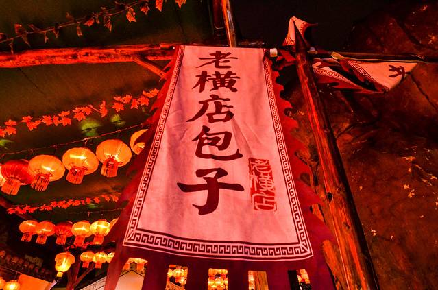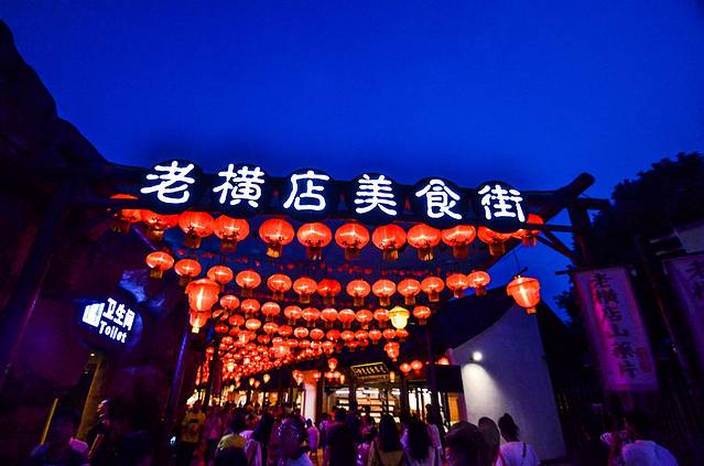 夜色下的老横店美食街显得更有美感。