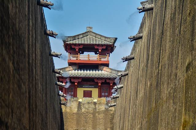 秦皇宫景区是整个横店影视城最早拍摄电影的地方,就是在现在也是拍摄很多武装片、历史片的重要拍摄基地与踩点的地方。所以,秦王宫里游览遇到明星的几率也许是非常高的地方了。