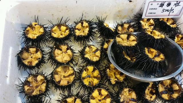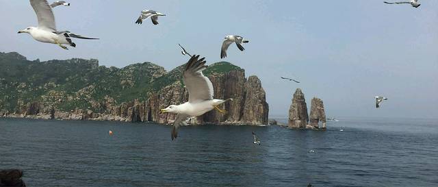 虽然夜里下了雨,但早上天气放晴,可以海上游了。海上游有三个价位:快艇每人200元;一般游轮每人180元;豪华游轮每人260元。考虑到我们已不是寻刺激的年龄,所以放弃快艇。要舒适的旅游,我们选择豪华游轮。海上游一般是上午8:30发船,12点返回。游轮在海上航行,海鸥们追逐着游轮,船上的游客不断向空中抛撒着小香肠喂食海鸥,尤其是孩子们各个兴高采烈,有的还特意买了口哨来吸引海鸥。这里的海鸥很聪明,它们知道游轮上面有好吃的,所以每个游轮的上空都跟随着一群嗷嗷叫的海鸥。在海上可以远远望到长岛全貌,可以眺望砣肌岛上的灯塔,还有万鸟岛,海面上还有许多渔民们养殖的海产品,现在是休渔期,有的渔民正在自己的自留海里侍弄海产品,他们看到站在甲板上的游客会主动打招呼,游客们也招手回应。可以停靠上岸的岛是庙岛,上面有最早的妈祖庙。到达庙岛时已快12点,肚子有点小饿,路两旁烧烤小摊鳞次栉比,鱿鱼、玉米、鹌鹑蛋等都在烤,我们买了两根烤玉米先垫一垫。将近12点半时游轮回到长岛,海上旅程结束。