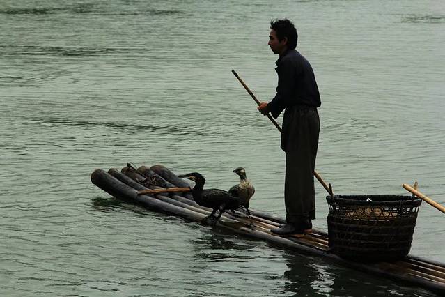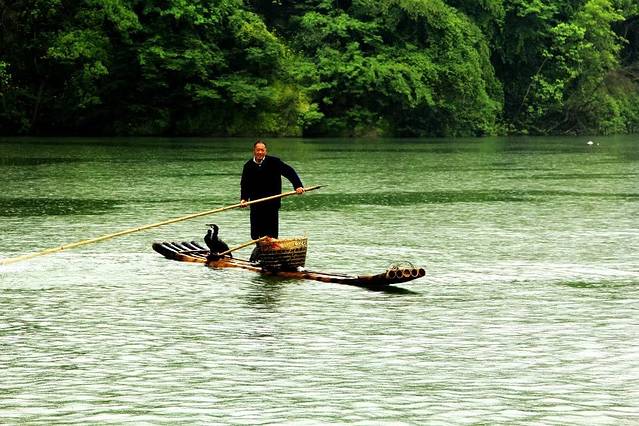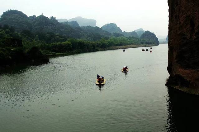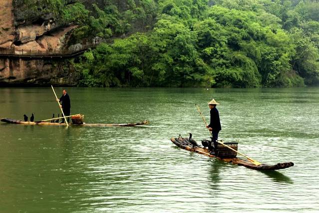 没有看到悬棺表演一是因为时间不正好,还有我们并没有多少兴趣。可能是为了五一节的表演,好几个竹排在排练鸬鹚捕鱼,有导演在指导的。雨越下越大,匆匆拍两张照就走了。