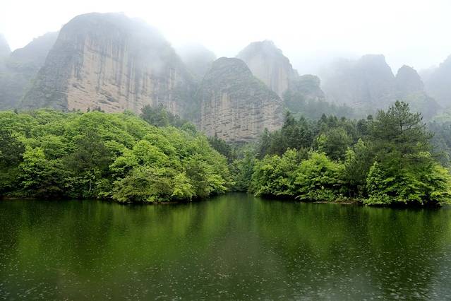 景区小火车把我们放下来的地方,就从这里开始爬山了。现在是不是五一节之前的淡季呢,游客特别少。进门的地方有一个小小的湖,雨滴打乱了湖水的平静,我们没能观赏青山绿树的倒影。然而薄雾迷漫,犹如仙境。