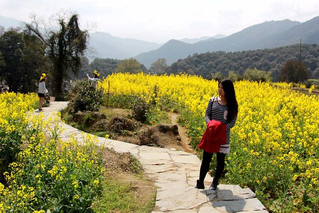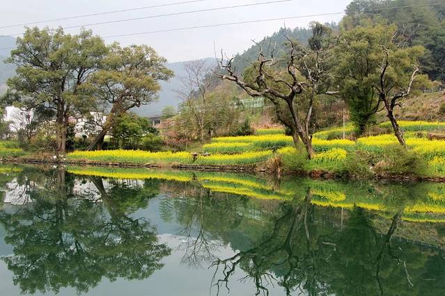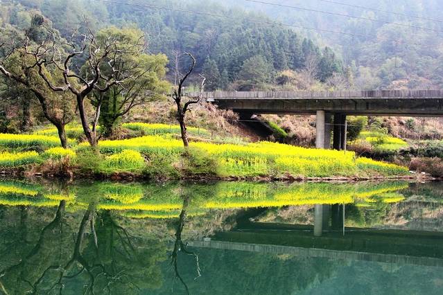 假如不是后来与司机产生的争执,一路上的风光真的称得上赏心悦目。绿水青山,沿河两岸一垄一垄的油菜花倒映水中,尽显江南的灵秀。司机会不时停车让我们拍照,当然后面证明他这不过是为了多收我们钱的借口。