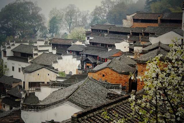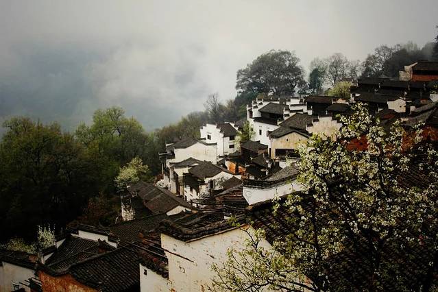 一个山顶上的小村庄,古朴的黄泥墙房屋随着地势高低错落,高大的梨树正开得灿烂,迷雾袅袅娜娜笼罩着远处的山,春风裹挟着蒙蒙细雨吹拂在脸上,如梦似幻。