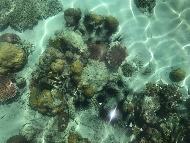 军舰岛浮潜海胆超多哈哈哈哈哈 记得穿潜水袜 不然扎到很痛 这里说下我没有去深潜 因为第一点我不会游泳蛮害怕的 第二我还蛮怕被晒黑的 第三背着氧气瓶我好像有点害怕 总结出来一个字就是怂