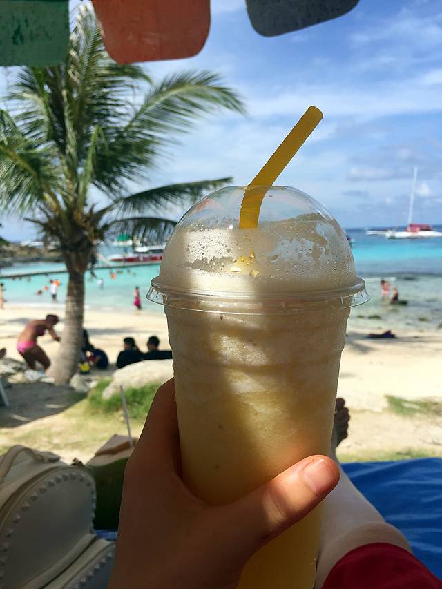 下午出发去了皇帝岛,200🐷四张躺椅,躺着喝东西休息。买了榴莲,芒果沙冰,菠萝沙冰,椰子,饮料基本都是100🐷。小伙伴说皇帝岛上的烤鸡翅是她吃过最好吃的。提供免费的水饮料以及水果!但全是冰的……