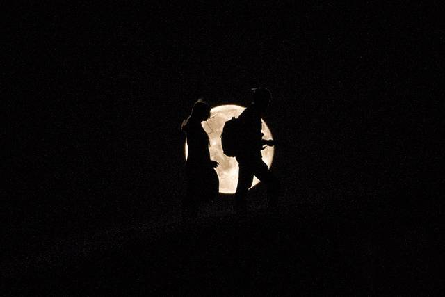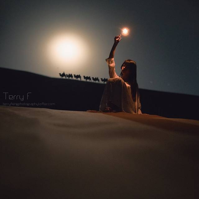 就在此时,我们看见十五的月亮正从两座沙丘之间缓缓升起,从外围光圈的微弱珠光,变作圆滚滚的一团银白色火焰,把整个乌兰布和沙漠点亮。