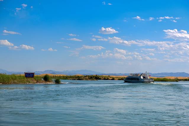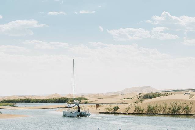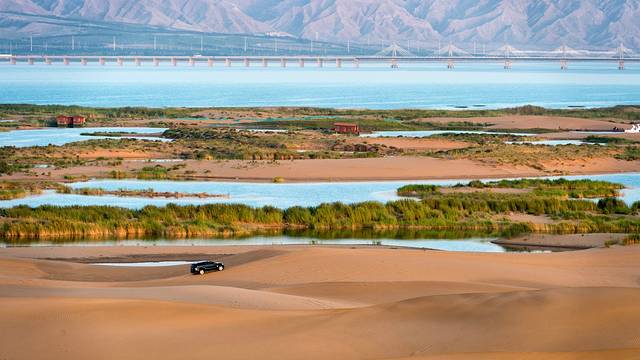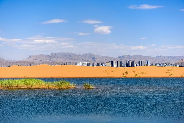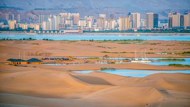 乌海湖景区坐落于乌海湖的点点沙丘之上,需要在码头乘船,穿过一片沙滩玉芦苇荡方能抵达。7月正午的太阳把城市晒得滚烫,但是一来的水边又能瞬感清凉。快艇在乌海湖上破浪而行,浪花朵朵向你的身上飞来,不要把它拒绝,这是来自蒙西人民的热情,要帮你洗刷午后的疲惫,在上岸前快快醒来。虽说乌海是一半沙漠一半海,而此时湖泊里的两岸确是一岸沙漠,一岸城市。这也许就是造物的神奇了吧,热与凉,静与动,城市与自然,在乌海这一处神奇的地方完美地相融。