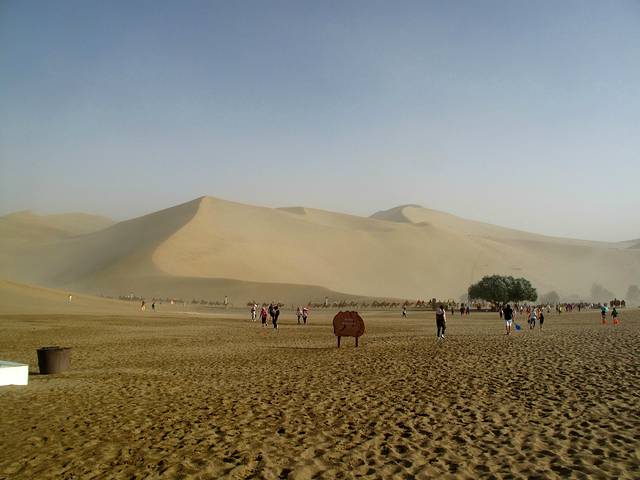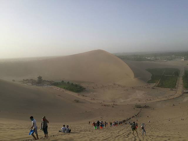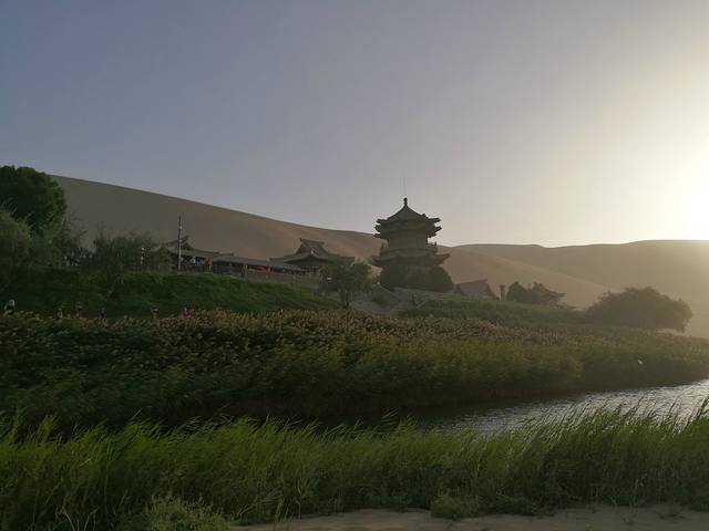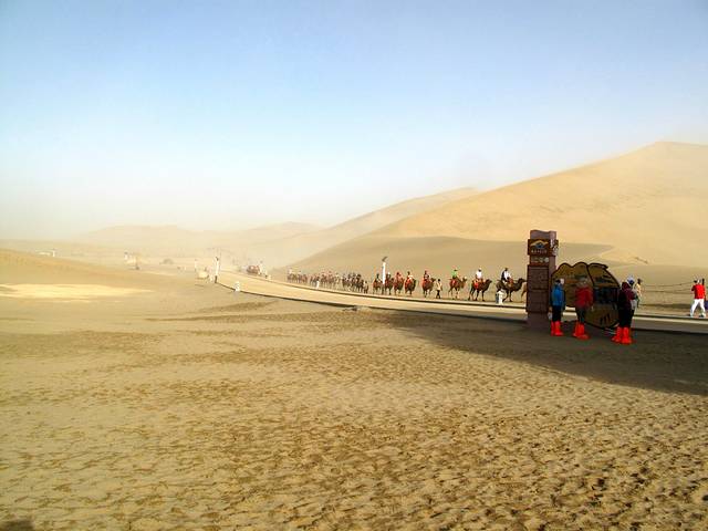 第10天:上面说了,不去莫高窟的话,今天白天就全空了。所以就晚起床,好好睡觉,连续这么多天都是早起,也蛮累的。大中午出去吃个饭,真热啊,紫外线非常强,市区最繁华的街上人都没有。一直在酒店休息到下午六点出发,因为敦煌白天非常热,特别是沙漠地区,一般是要么早上,要么傍晚去月牙泉的,敦煌相比于青海是真热啊,这个安排是很合理的,还有就是无论是宁夏,青海,还是甘肃,夏天日落很晚,所以完全可以傍晚出游。月牙泉和鸣沙山就是同一个景区的,门票120元。鸣沙山确实跟之前的腾格里和沙坡头不一样,山更高大,沙更细软,绝对值得一去!就是当天突然起风沙了,而且非常大,根本没法张嘴,喝水,说话,游玩。唉。。。不过有好也有坏,让我也体验感受了大漠风沙的感觉,是不是跟电影小说里的一样。那感觉真心难受,因为没法用嘴巴呼吸,造成呼吸困难,很累很难受,全身上下全是沙,脸上全是沙泥,那一刻我感觉自己就像电影里的大漠行者!哦,想起了一点说一下。前面的腾格里,沙坡头进去时,是没必要租鞋套的,但在鸣沙山有这个必要,因为沙子细软,鞋子会陷入沙地,很容易鞋子进沙。沿途有小贩让买滑沙板,这个真没必要,不要买!套相机和手机的套子是有必须买的。里面有专门滑沙的地方和滑沙板,自己带的板是滑不动的。沙漠里有很多沙漠项目可玩,骑骆驼,越野车之类的。旁边就是月牙泉,真心没意思,泉水听人说,是加水进去的,就早干枯了。就沙漠里建个楼,旁边有个水池。因为风沙太大,没法长时间待景区就出来了。我特意问了下别人,得知平常这个季节没什么风沙的,就是今天比较特别。呵呵呵,反正我已经玩了宁夏的沙漠了,也无所谓了。这里说一句,沙漠里的项目价格是比较贵的,但出来玩了,这个就不要省了,难得去次沙漠,一定要体会一下,因为我都试过项目,感觉非常好,这钱花得还是值的!晚上去吃了当地最有名的驴肉黄面,其实就是类似于拌酱面加了驴肉,味道还行,驴肉量很足,价格不贵,能接受。饮料是当地特产--杏皮水,三块钱一杯,还不错。可以买些葡萄和哈蜜瓜回酒店吃。