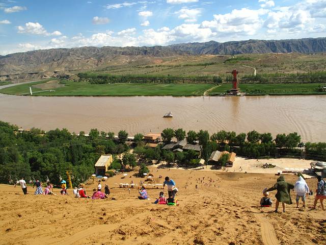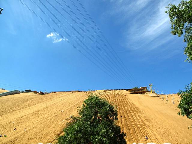 滑沙,落差有100米,看着吓人,实际下滑速度并不快,上面是飞索,横跨黄河的,够刺激!扶梯在照片的左边