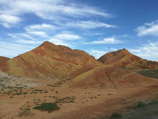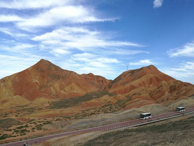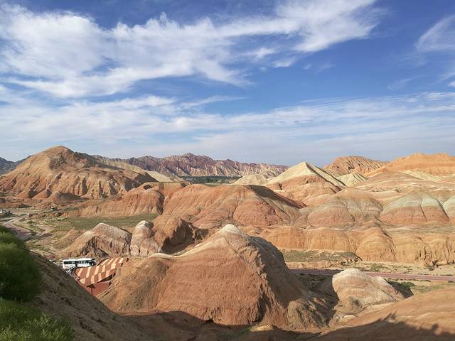 傍晚到达张掖七彩丹霞,这个景区是我觉得整个行程中最值的一个景区。门票才72元。里面是三个点,三个点之间要坐摆渡大巴,免费的,而其它景区全是要另买电瓶车钱的。从景色和服务角度来讲,张掖七彩丹霞是最好最好的。景区内就是三个点,每个点上建了观景台,大家在观景台上欣赏,拍照。说真的,此景区的景点从漂亮来讲,是本次旅程中的第一,真心的漂亮!点赞!晚上就住在景区对面的那一排小别墅群,每个酒店都是几幢楼,此酒店是本次旅程中住得最好的酒店。大家记的,自己订酒店的话就要订七彩镇,也就是景区旁边的这个地方的酒店,第一是给司机方便,第二自己住得也舒服,价格也不会很离谱,好像旺季也就300+标房,淡季200+标房。酒店是全新的,房间里的设施全是新的,很好。