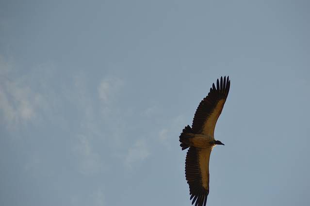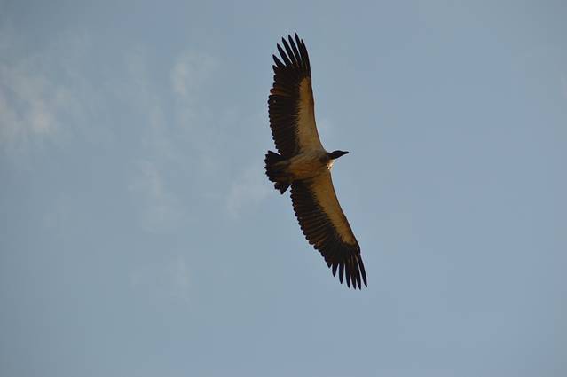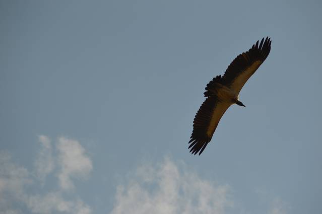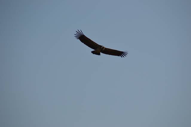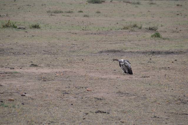 再走,突然出现一大群秃鹫。它们正在分享一只死去的角马。这里就看谁力量大了。它们打架也很奇特,一只鸟张开大翅膀,跳着驱赶另一只秃鹫,样子好不滑稽!它们降落也很帅,它们会从很远处停止扇翅膀,大开翅膀滑翔,接近地面时把脚一伸,跳几步就停下了。它们吃东西时样子更奇怪,它们脖子很长,于是它们把脖子使劲向下伸,再打一个弯,把头向上伸,脖子最低处都快碰地了,那样子如果是个人,一定是特别猥琐。