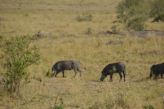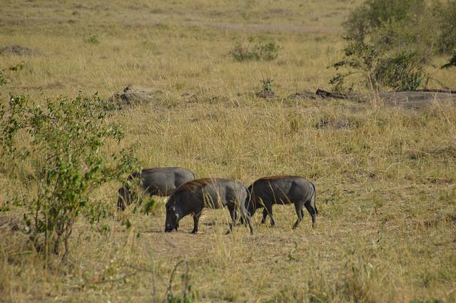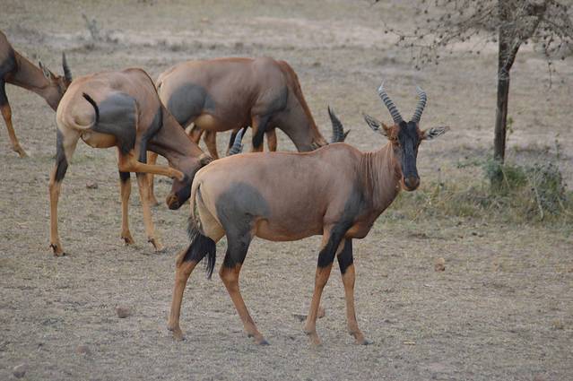 一条小河出现了,有几只水牛,也叫野牛。不过它们与纳库鲁的亲戚截然不同,它们的皮显得更加厚实。它们的角更宽,也是盘起来相互对着,但两角夹间的距离更大。它们旁边还有几只斑马,斑马不知为何在此很少见,这几只中有一只小斑马,全身,只要是成年斑马是黑色的地方,它全部为棕色,就好像在沙地上刚打完滚一样。