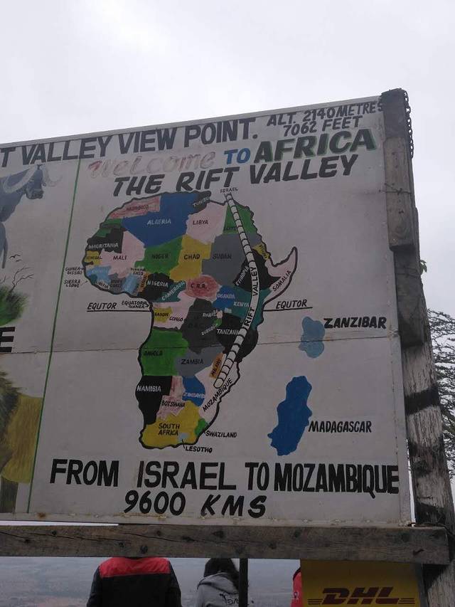 车首先停在了高山上一个卖东西的地方,就是一排很简易的房子,但房子旁面有一个大大的地图,画着一张非洲地图和一条长长的裂痕,看到地图我们才知道,站在这里,是以眺望整个东非大裂谷最佳的地点。