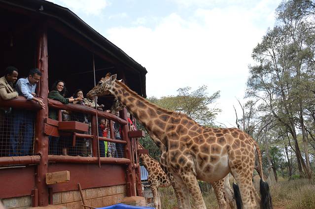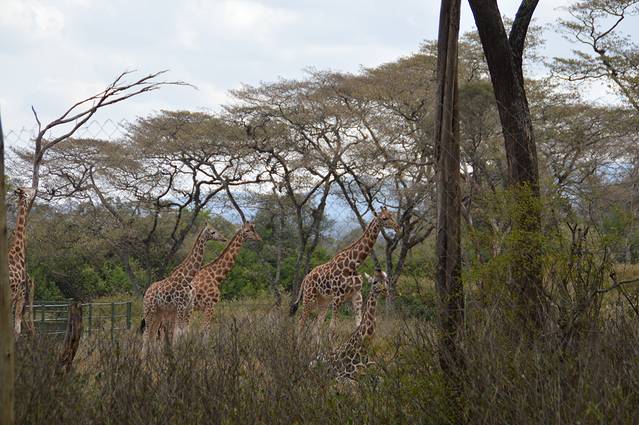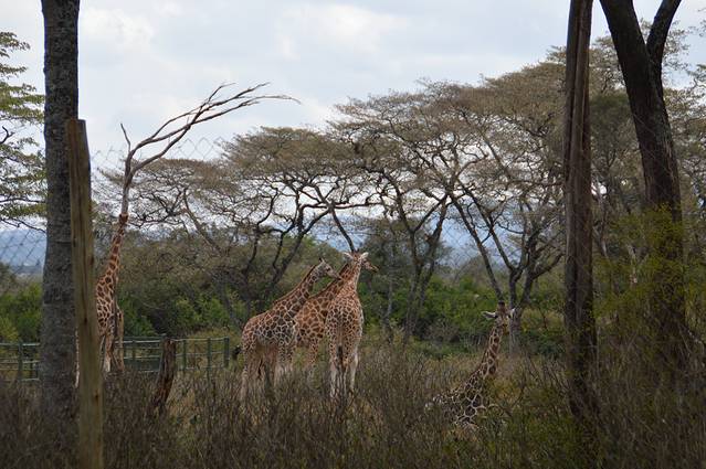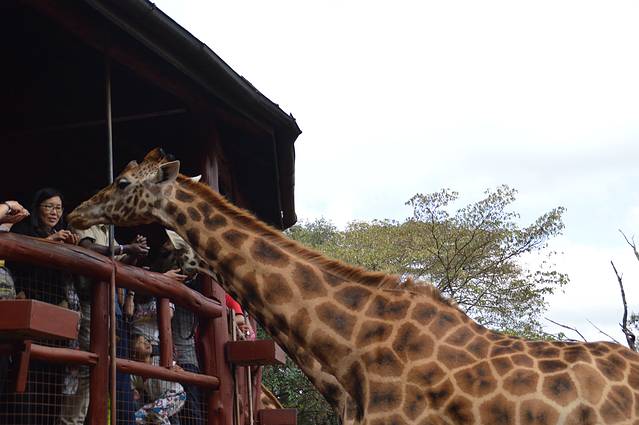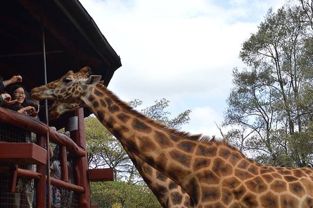 下午去看了长颈鹿中心,我们以为很大,结果就是很小的一片树林,里面都是一些当时抢救过来的长颈鹿,肯尼亚的长颈鹿原来种类很多,但是几年的捕杀让许多种类接近于濒危,所以这个中心就是抢救这些物种的。而且这里你可以走近它们,而且中心还特意盖了一个高三层的楼,你站在三层楼上,正好与长颈鹿的高度相等,于是你就可以喂食它们了。在肯尼亚任何一个国家公园里,面对任何动物,哪怕是它渴死饿死,你都不能喂食它们,这是法律,也是自然规律。也正是因为这样,在肯尼亚所有国家公园的动物眼里,人就是可有可无的一个存在,所以它们也从来不在意人们怎么看它,因为人不会喂食它们,所以也没有养成动物的习惯,不像国内峨嵋山的猴子,游人喂食惯了,见人不抢。