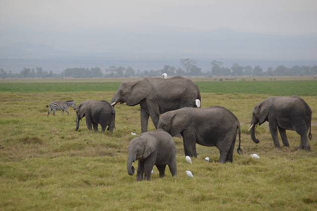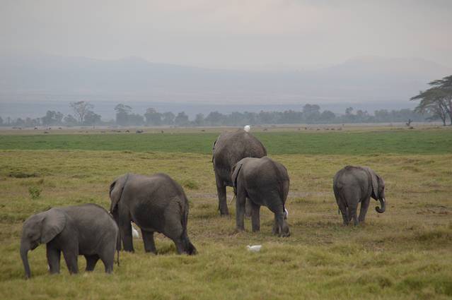安博塞利国家公园的大象群,有一只白色的鸟与大象共生共存