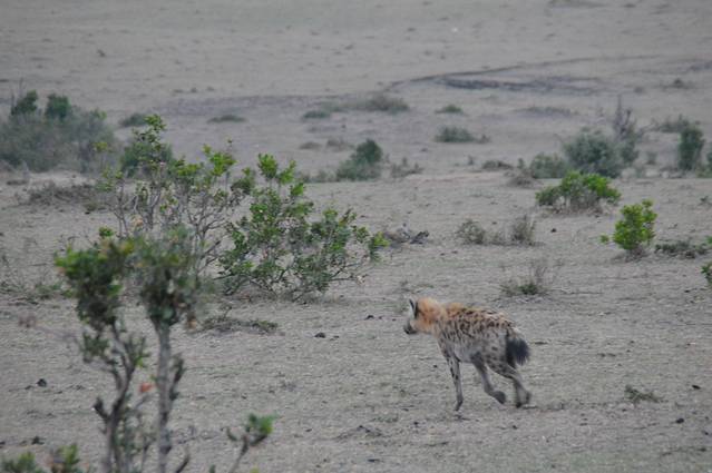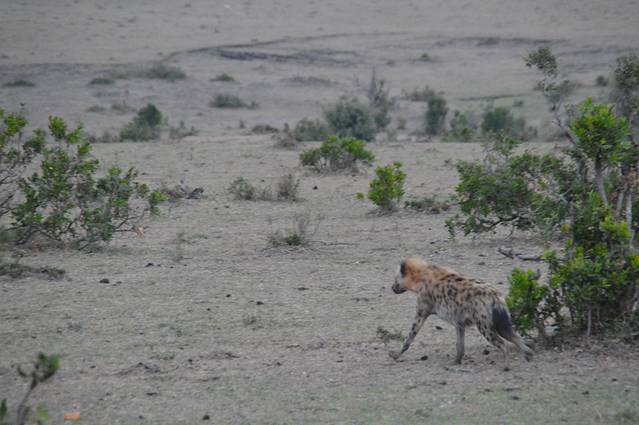 突然路上窜过几只小动物,看上去想鼬鼠。它们后背脊呈现银灰色,在车灯照射下闪闪发光。后背下面有一道黑色条纹,再向下的肚皮则为白色。我们只是惊鸿一瞥,它们就消失了。一会儿又出现了两只鬣狗。它们身上有无数黑点,远看就像豹纹。