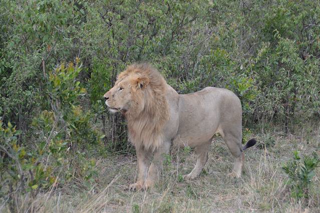 车提速了。很快一片草丛出现了,里面竟然卧着四只狮子!两只公狮子两只母狮子。突然,一只母狮径直走开了。紧接着,一只公狮子也迈开了步伐。母狮子在前面走得很快,公狮子则在其后,不紧不慢地跟着。两者距离很大。我们赶紧驱车去追母狮子,母狮子就从车前悠闲地走过,同时伴着“呃嗯”低沉叫声,就像一个人在呜咽一样,而那只公狮子在其后,走走停停,不断嗅着气味,走的路线与母狮子一模一样。好家伙,它们要去干什么?抬头看,那只母狮子偶尔也会停下,等一等公狮子。不一会,它们一起消失在了山那边。