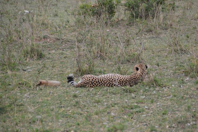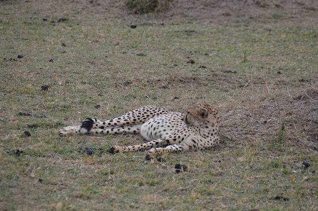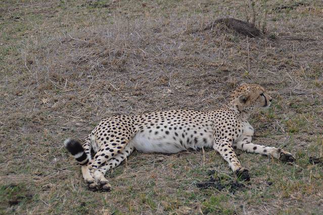 进入草原,今天要去马拉河,不过要走很远的路。首先映入眼帘的是猎豹一家四口。猎豹妈妈正带着她的三个宝宝在休息。一只猎豹宝宝看见我们还有些害怕,赶紧爬到了妈妈那里。
