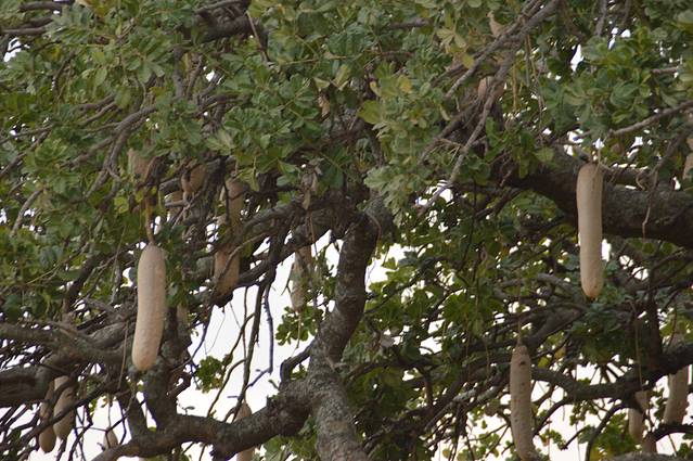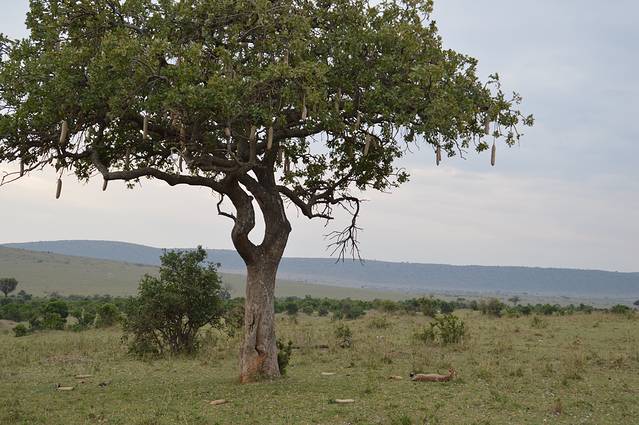 草原上屹立着一棵香肠树。它的果实真的像极了香肠!正好,一棵成熟的香肠落了下来。吓了树下的动物一大跳。等等!树下那是豹子!Faruk赶紧把车开近。豹子正在休息,前爪、后爪分别并在一起伸着,它的头真好看着我们。它的耳朵一直在动好像在倾听什么。它的尾巴也不时拍动,不过,它好像饱了,对我们没兴趣。终于有机会近距离看它的脸了!它的眼是梯形的,上边宽一些,眼睛是红色的,眼睛下方伸出一道黑线,像是它脸上的伤疤一样,有几分社会大哥的风范。它的身上,当然也密布着无数黑色斑点。