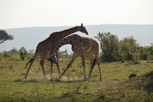 早上又看了看,竟然出现了长颈鹿打架的情景。它们打架也算打出一朵花了。它们会弯下脖子碰头上的角,也会用角去戳另一只的大长腿,更有甚者,它们竟然会用角去攻击另一只的肚子!但怎么看都不像是在打架,倒像是夫妻俩在交流感情。一个词如果可以形容这场战斗的话当之无愧的是“温柔”。