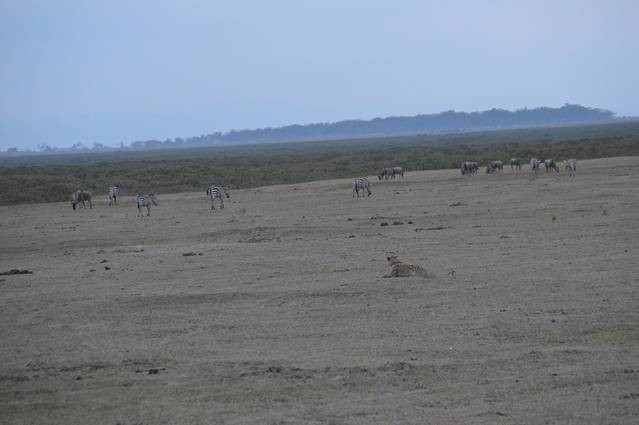 早上毕竟不属于斑马、羚羊,而是另一个杀手---鬣狗。它们长相非常像狼,只是毛色有点杂,尾巴也是耷拉着,与草地分不清区别,尤其是与早上昏暗的草地十分相似。若不是Faruk提醒我们都发现不了它们。它们三个呈三角形正正缓慢地向一只斑马靠近。它们压低着身子,缓慢但坚定地迈着步伐,不过斑马也很警觉,很快就跳出了包围圈。