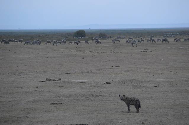 安博塞利国家公园鬣狗在准备偷袭角马,近处的是鬣狗